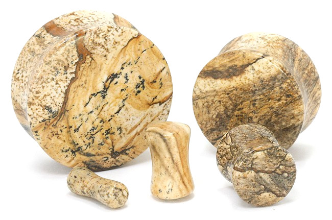 Плаги из яшмы Пикассо, получившей своё название за необычную расцветку, напоминающую рисунки позднего Пиккасо в стиле абстракционизма. Рисунок каждого плага уникален. Цвет варьируется от светло-бежевого до тёмно-коричневого с вкраплениями чёрного.
