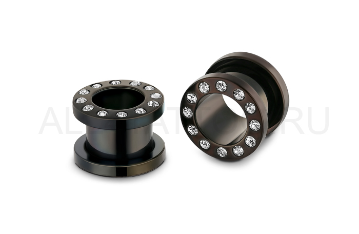 Тоннели из стали 316L с черным PVD покрытием, украшенные прозрачными стразами.