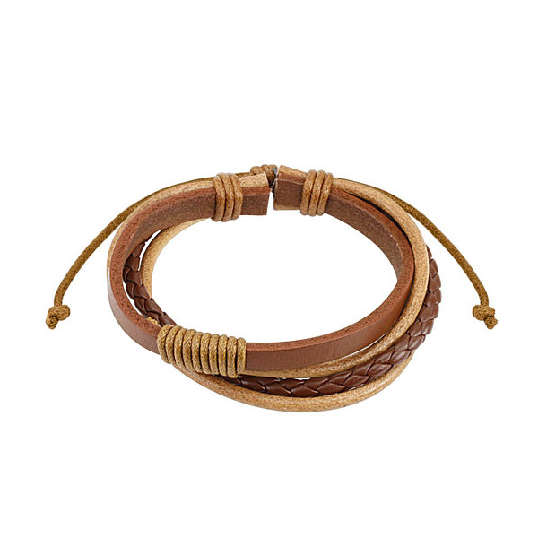 Браслет из кожаной полосы с текстильной перетяжкой, плетенкой и бежевыми шнурками.