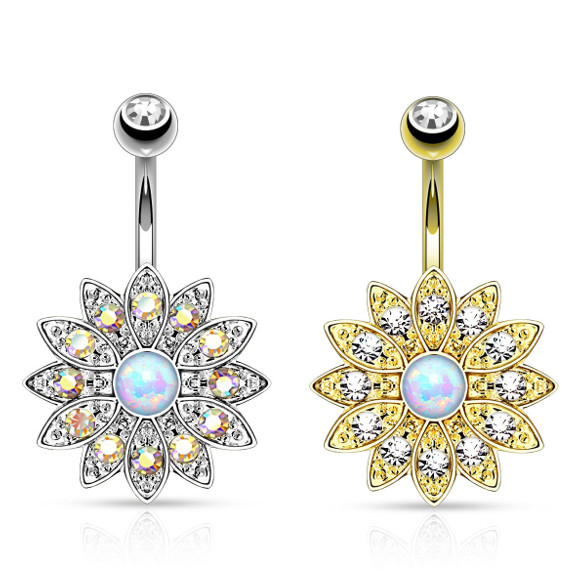 Банан из хирургической стали 316L с декоративной частью из родированной латуни. Украшен белым лабораторным опалом.Представлен в двух вариантах: классический стальной с переливающимися кристаллами и с золотым PVD покрытием и прозрачными кристаллами.