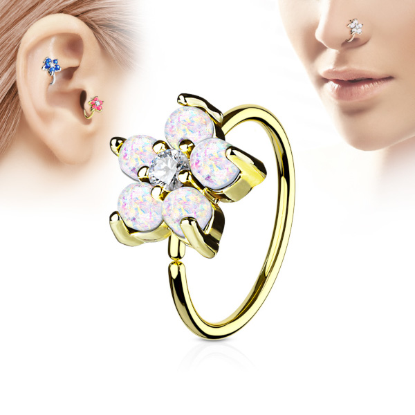 Раздвижное кольцо из хирургической стали 316L с золотым IP покрытием. Украшено латунным цветком из опалов со стразом по центру.