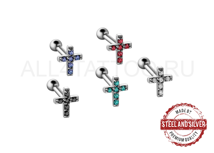 Микроштанга из хирургической стали 316L с внутренней резьбой. Декоративный крест размером 4,7х6мм украшен кристаллами Swarovski Zirconia.
