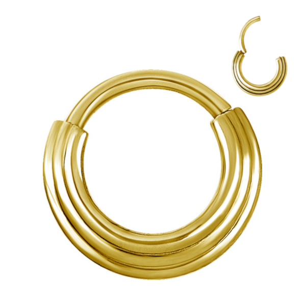 Кликер в виде тройного кольца из хирургической стали 316L с 24х каратным золотым PVD покрытием.