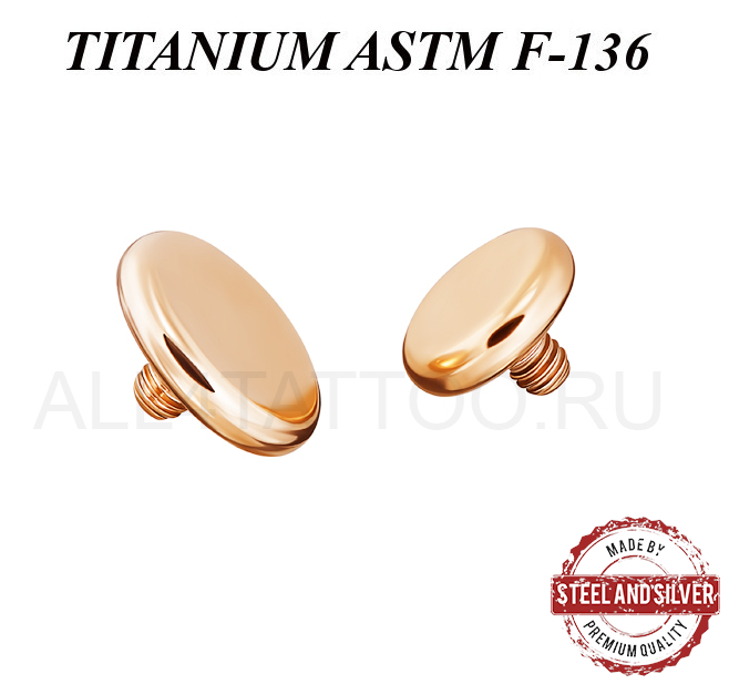 Накрутка в форме диска из имплантационного титана ASTM F-136 с PVD покрытием розового золота. Резьба накруток 1,2мм подходят к микродермалам и украшениям толщиной 1,6мм с внутренней резьбой.