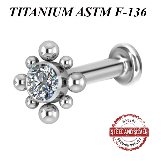 Лабрет из имплантационного титана 6Al-4V-Eli ASTM: F-136 с внутренней резьбой. Украшен кластером Premium Crystals, диаметр кристалла 3мм.