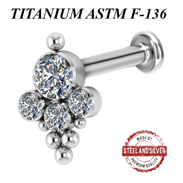 Лабрет из имплантационного титана 6Al-4V-Eli ASTM: F-136 с внутренней резьбой. Украшен кристаллами Swarovski диаметрами 4 и 2 мм.