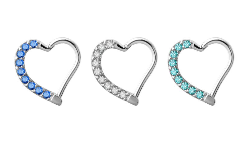 Кликер из хирургической стали 316L в виде изящного сердца, украшенного кристаллами Premium Zirconia.