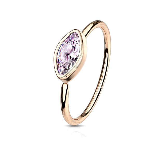 Раздвижное кольцо из хирургической стали 316L с IP покрытием розового золота. Украшено стразом огранки "маркиз" размером 3х5мм в латунной декоративной части.