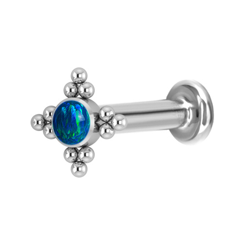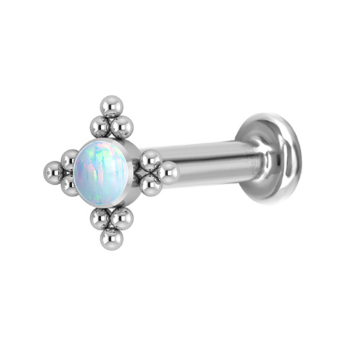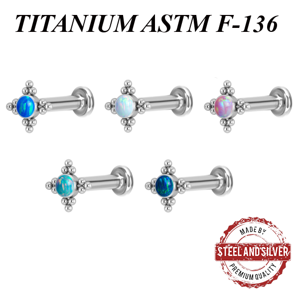 Лабрет из имплантационного титана 6Al-4V-Eli ASTM: F-136 с внутренней резьбой. Украшен искусственным опалом диаметром 3 мм.
