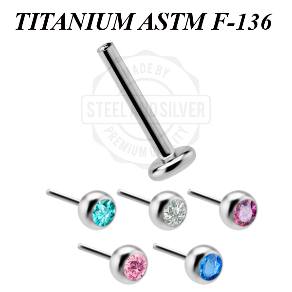 Безрезьбовой лабрет из имплантационного титана 6Al-4V-Eli ASTM: F-136. Украшен кристаллом Premium Zirconia диаметром 2.5, 3мм.
