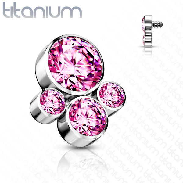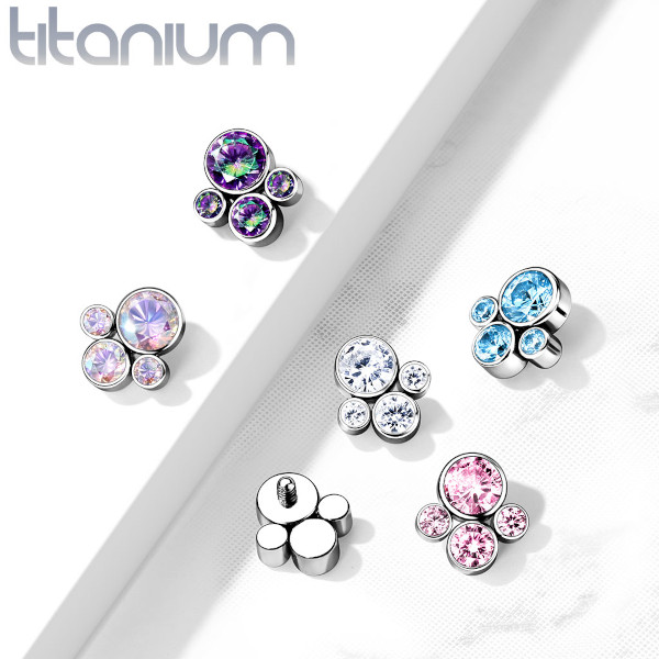 Кластер из имплантационного титана 6Al-4V-Eli ASTM: F-136 украшен стразами. Резьба 0,9мм подходит для украшений толщиной 1 и 1,2мм с внутренней резьбой, резьба 1,2мм подходит для украшений толщиной 1,6мм с внутренней резьбой.