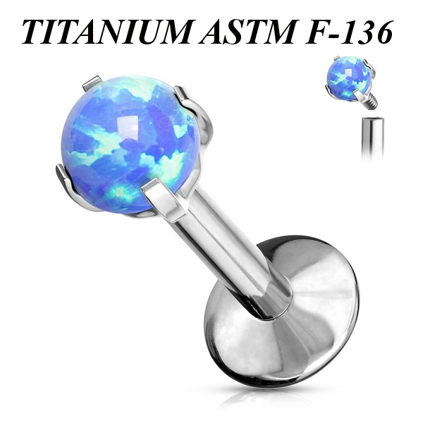 Лабрет из имплантационного титана 6Al-4V-Eli ASTM: F-136 украшен лабораторным опалом в лапках. Внутренняя резьба.