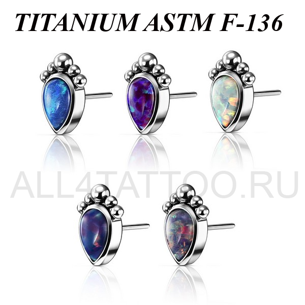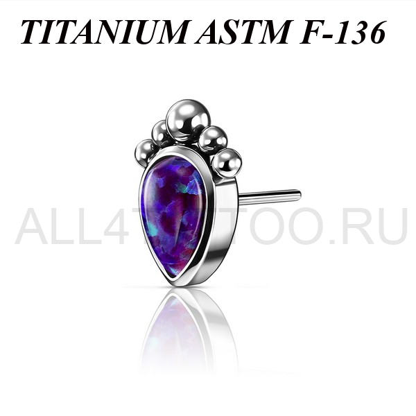 Вставка из имплантационного титана 6Al-4V-Eli ASTM: F-136 для безрезьбовых украшений. Украшена лабораторным опалом в форме капли. Размер декоративной части 6х5мм.