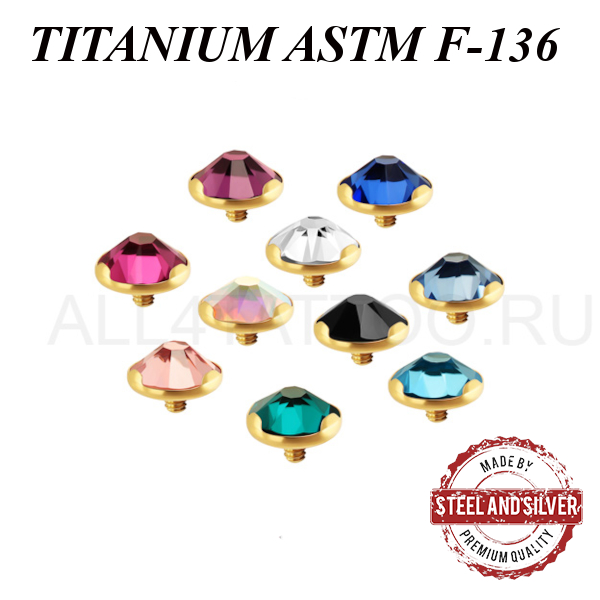 Накрутка из имплантационного титана ASTM F-136 с 24х каратным золотым PVD покрытием. Украшена премиальным кристаллом в лапках. Подходит для украшений толщиной 1,6мм с внутренней резьбой.