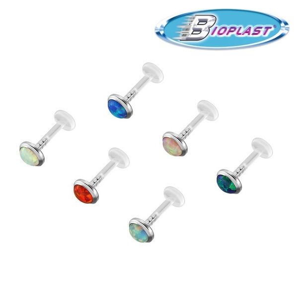 Лабрет из материала Bioplast со вставкой из имплантационного титана 6Al-4V-Eli ASTM: F-136, украшенной лабораторным опалом.