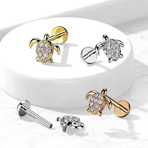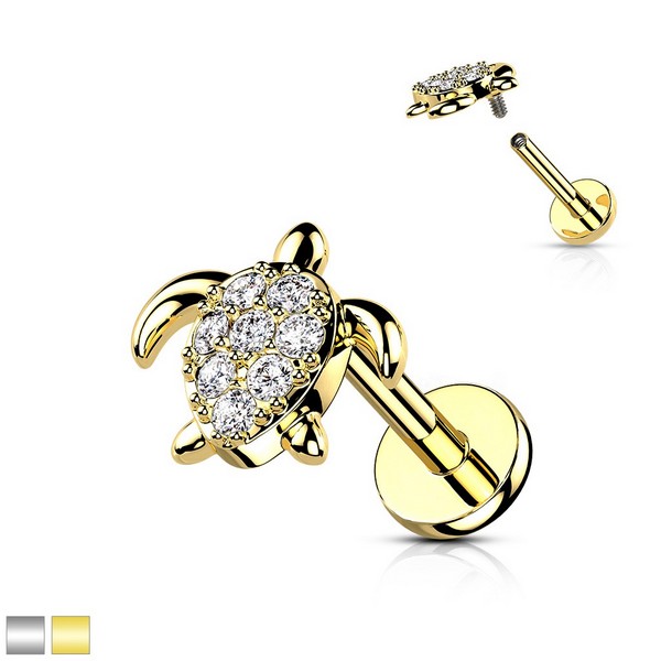 Лабрет с внутренней резьбой из хирургической стали 316L с накруткой в форме черепашки из родированной латуни, украшенной прозрачными кристаллами. Представлен в двух вариантах: родированный и с золотым PVD покрытием. Размер декоративной части: 7х6,5мм.