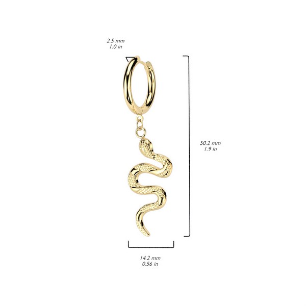 Серьги из хирургической стали 316L с подвеской в виде змеи. Представлен так же вариант с золотым PVD покрытием. Размер подвески: 28х14мм.
