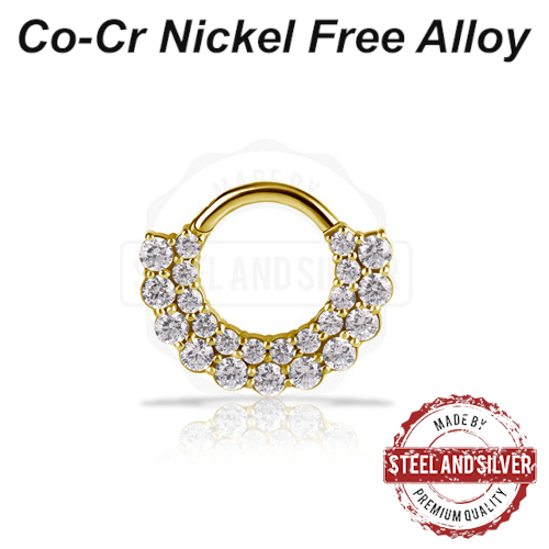 Кликер из сплава кобальт-хрома, без содержания никеля. Украшен двойным рядом прозрачных кристаллов Premium Cubic Zirconia. Представлен так же в варианте с 18-каратным золотым PVD покрытием.