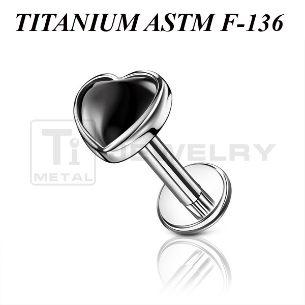 Лабрет из имплантационного титана 6Al-4V-Eli ASTM: F-136 с внутренней резьбой. Накрутка в форме сердца украшена минералами:
