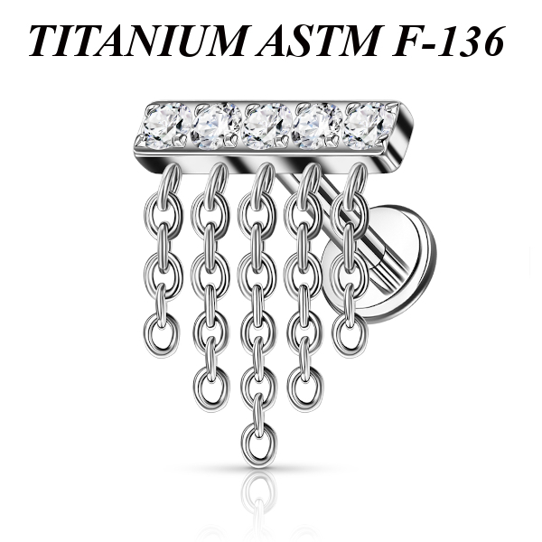 Лабрет из имплантационного титана 6Al-4V-Eli ASTM: F-136 в, украшен дорожкой прозрачных фианитов с цепочками. Внутренняя резьба. Размер декоративной части: 9х12мм.