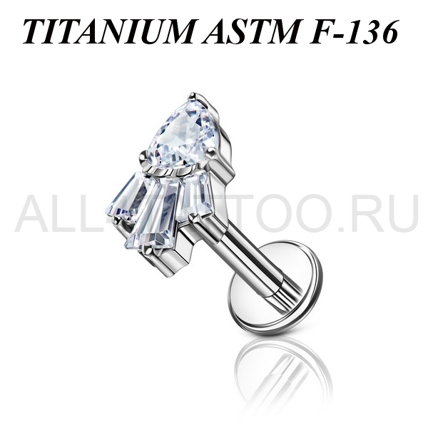 Лабрет с внутренней резьбой из имплантационного титана 6Al-4V-Eli ASTM: F-136. Украшен кластером с прозрачными фианитами. Размер декоративной части: 4,5х7мм.