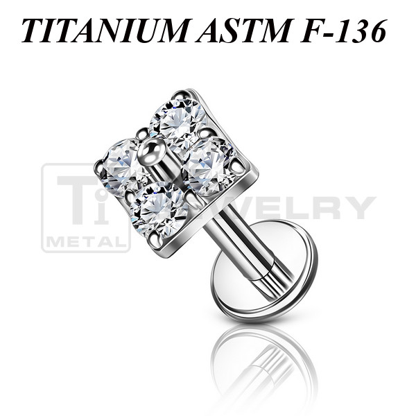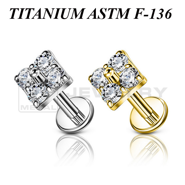 Лабрет с внутренней резьбой из имплантационного титана 6Al-4V-Eli ASTM: F-136 с накруткой украшенной прозрачными фианитами. Представлен в двух вариантах: классический титановый и с золотым PVD покрытием. Размер накрутки: 4,3х4,3мм.
