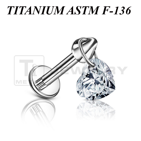 Лабрет из имплантационного титана 6Al-4V-Eli ASTM: F-136 с накруткой в виде пики и подвеской из фианита в форме сердца. Размер пики: 3х3мм, размер подвески: 5х5мм.