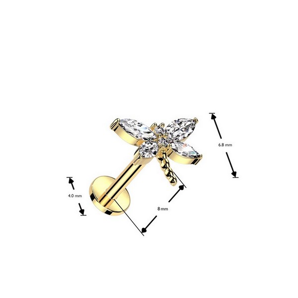 Безрезьбовой лабрет из хирургической стали 316L со вставкой из родированной латуни, украшенной прозрачными фианитами. Представлен в двух вариантах: классический стальной и с золотым PVD покрытием.