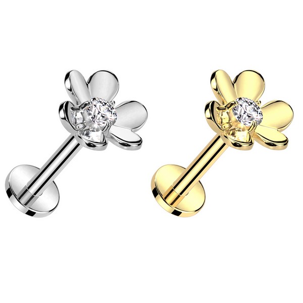 Безрезьбовой лабрет из хирургической стали 316L со вставкой из родированной латуни, украшенной прозрачным фианитом. Представлен в двух вариантах: классический стальной и с золотым PVD покрытием.