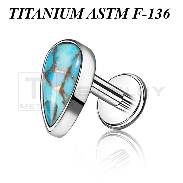 Лабрет из имплантационного титана 6Al-4V-Eli ASTM: F-136 с внутренней резьбой. Украшен накруткой в форме капли с искусственной бирюзой и медными прожилками. Размер накрутки: 3,6х6,6мм.