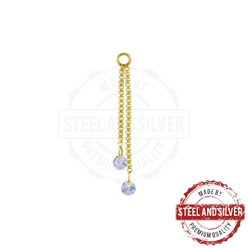 Подвеска-цепочка из хирургической стали 316L с PVD покрытием 24х каратного золота. Украшена кристаллами Cubic Zirconia. Подходит для украшений толщиной не более 1,6мм. Длина украшения указана вместе с кристаллами.