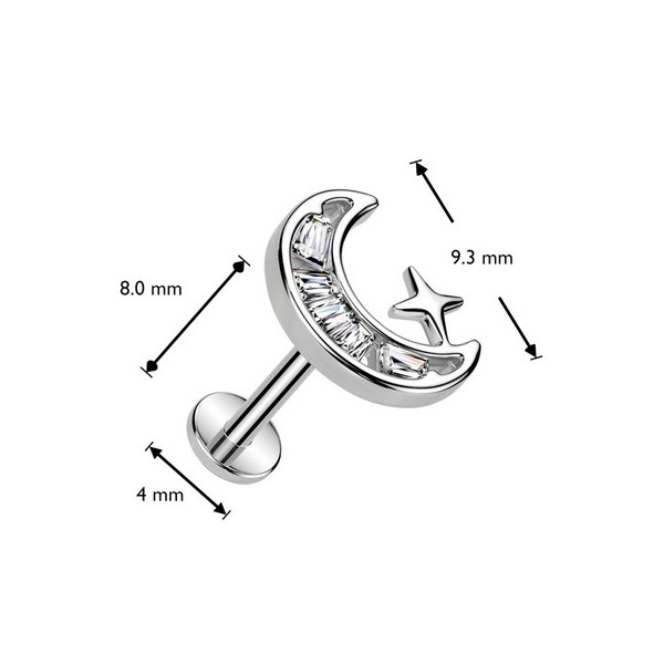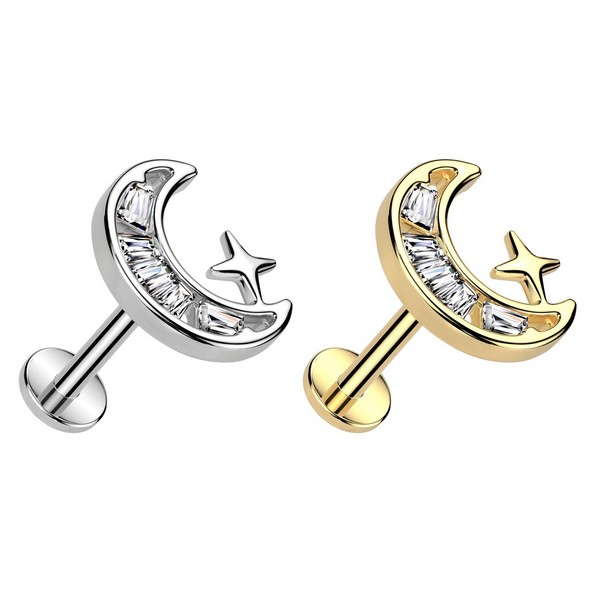 Безрезьбовой лабрет из хирургической стали 316L с декоративной частью из родированной латуни. Украшен фианитами. Представлен в двух вариантах: классический стальной и с золотым PVD покрытием. Размер декоративной части: 7,4х9мм.
